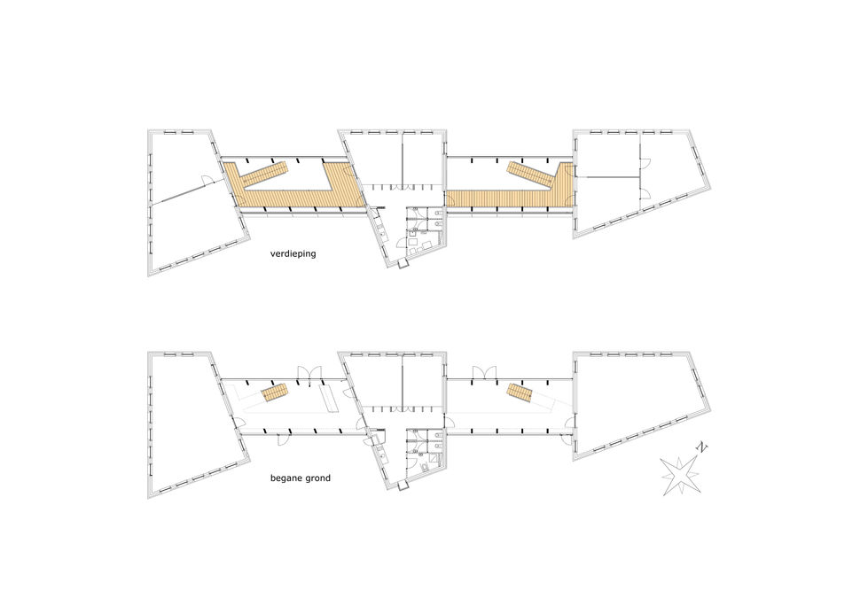 Tussen deze stenen volumes bevinden zich transparante tussenleden van glas en hout. Deze lichte, open verbindingen fungeren als de vitale organen van het gebouw; hier bevinden zich de entree, de trappartijen en de informele vergader- en lunchruimtes.